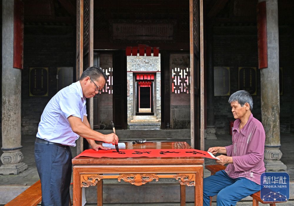 8月15日,一名楹聯愛好者在大蘆村古宅里寫對聯。