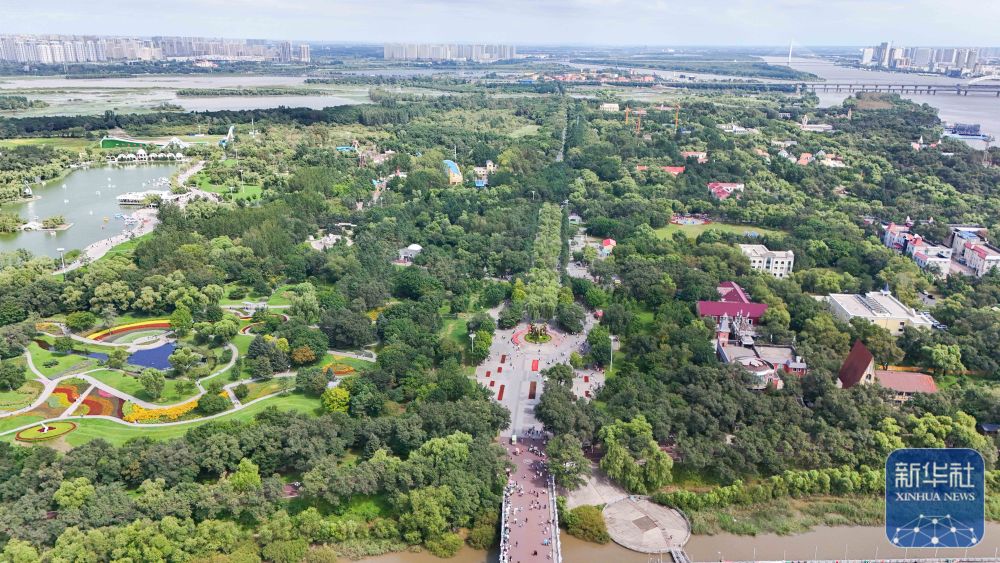 人們?cè)邶埥ぜ瘓F(tuán)綏棱林業(yè)局生態(tài)文化旅游景區(qū)一處公園游覽(7月25日攝,無(wú)人機(jī)照片)。