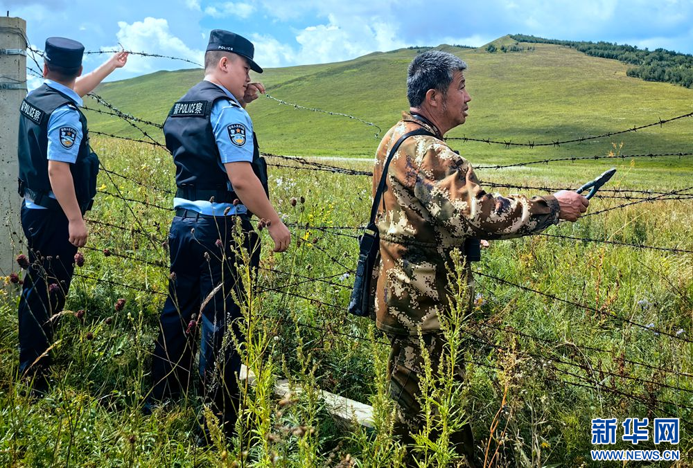 ??王玉發(右)與邊境警察在修補網圍欄。新華網發