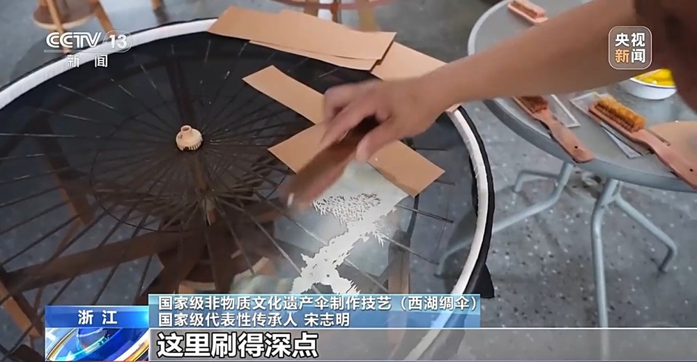 國家級非物質(zhì)文化遺產(chǎn)傘制作技藝(西湖綢傘)國家級代表性傳承人 宋志明:刷出來的圖案有靈動感,這是其他噴繪、繪畫所出不來的效果,特別是在絲綢傘面上來畫,通過顏料的霧狀,刷花呈現(xiàn)的效果是獨(dú)一無二的。