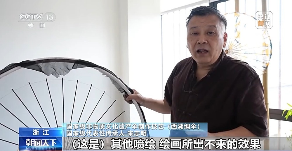 國家級非物質(zhì)文化遺產(chǎn)傘制作技藝(西湖綢傘)國家級代表性傳承人 宋志明:絲綢是夾在中間的,我們的傘面是夾在中間,所以說收攏你是看不到傘面的,這個(gè)是獨(dú)一無二的。