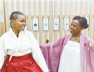 當地時間4月20日,為慶祝第十五個聯合國中文日,南非德班理工大學孔子學院舉辦以“說文解字,以茶會友”為主題的活動。活動參與者身穿中國傳統服飾,共同探討漢字和茶文化。圖為兩名當地女孩試穿中國傳統服飾。