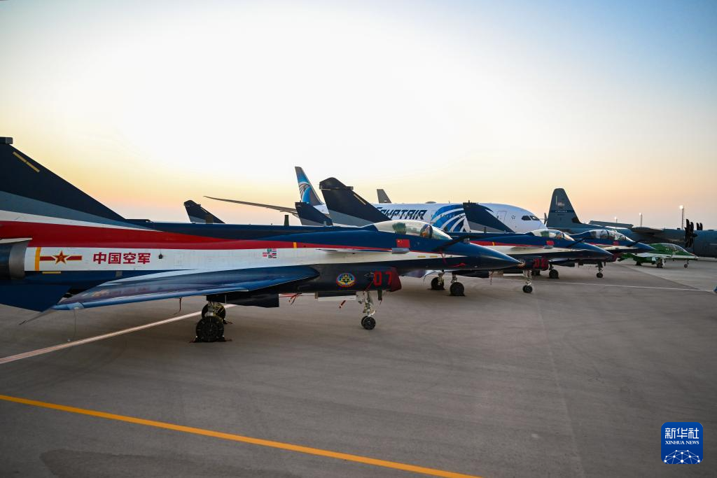 9月3日,在埃及阿拉曼開(kāi)幕的首屆埃及航展上,中國(guó)空軍八一飛行表演隊(duì)殲-10表演機(jī)進(jìn)行靜態(tài)展示。新華社發(fā)(周雪峰 攝)