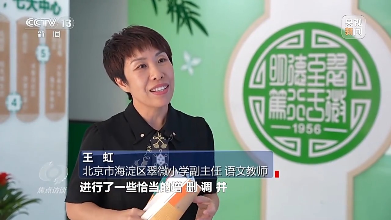 北京市海淀區翠微小學副主任、語文教師 王虹:拿到教材,我們心里特別踏實,我們發現這個教材進行了一些恰當的增、刪、調、并。一年級上學期識字量上原來是300個,現在280個,還有一些對學生理解起來有一些難度的課文,也進行了刪減或者調整。