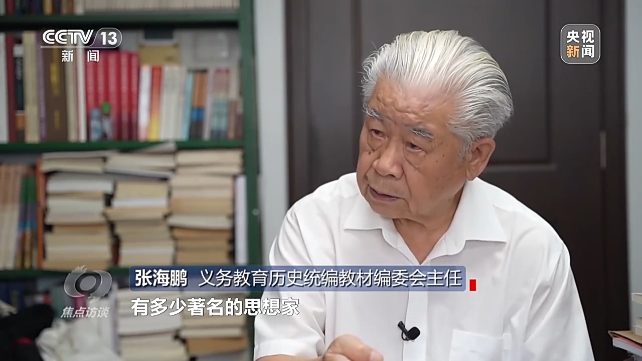 義務教育歷史統編教材編委會主任 張海鵬:講我們中國歷史上每一代有多少著名的思想家,有多少著名的政治家、軍事家、戰略家、科學家,對人類有貢獻的發明創造、文學藝術。這就是告訴我們,中華的文化是優秀的,是值得我們熱愛的。