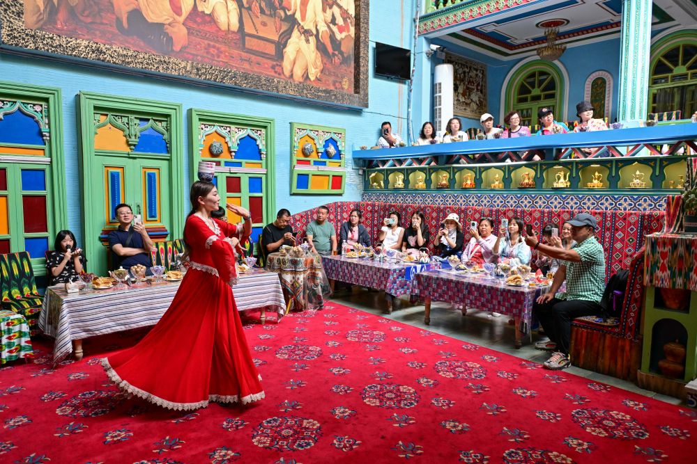 在新疆喀什古城景區(qū),游客在“古麗的家”民宿內(nèi)欣賞文藝表演。新華社記者 丁磊 攝
