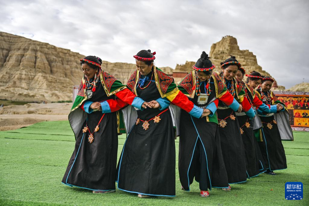 在西藏阿里地區札達縣古格王國遺址腳下,當地村民表演“宣舞”(9月11日攝)。
