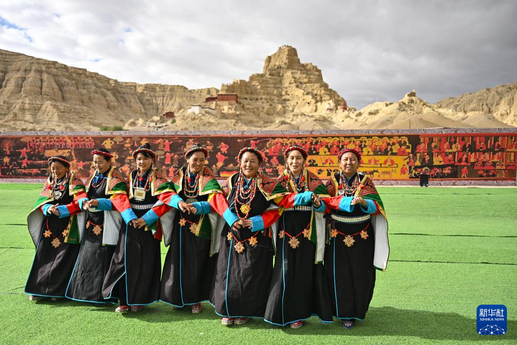 在西藏阿里地區札達縣古格王國遺址腳下,當地村民表演“宣舞”后互相交流(9月11日攝)。
