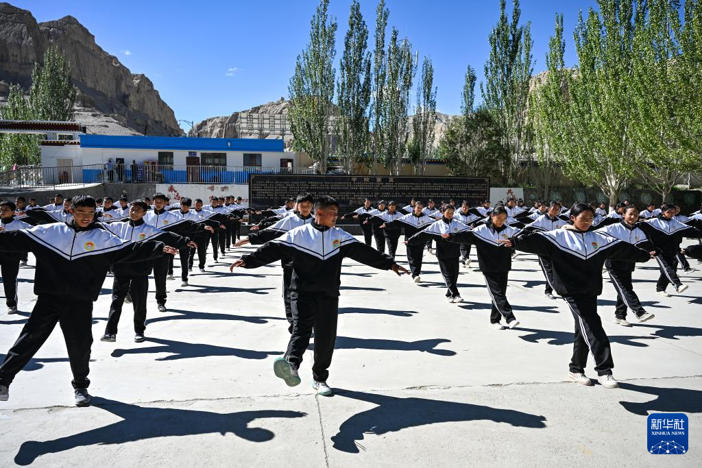 在西藏阿里地區札達縣九年一貫制學校,學生們跳起融入“宣舞”特色的課間操(9月10日攝)。