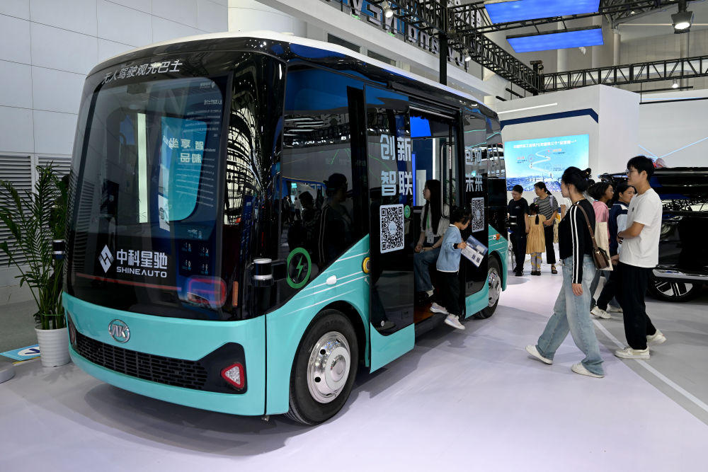 9月21日,在2024世界制造業大會上,人們參觀體驗一款無人駕駛觀光巴士。新華社記者 黃博涵 攝
