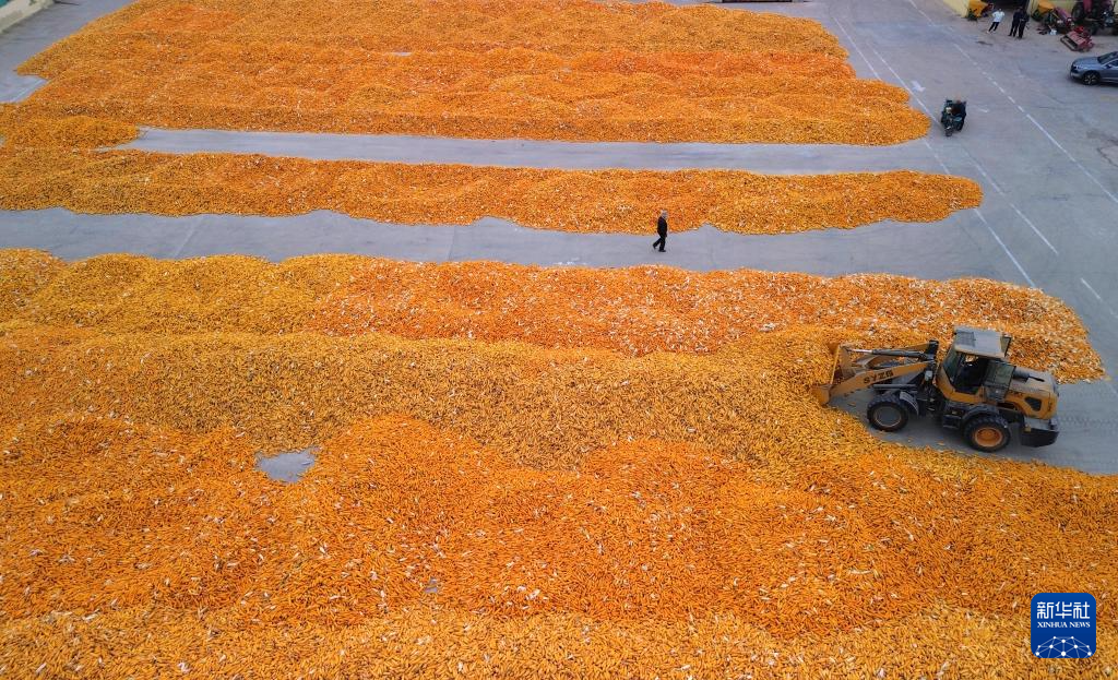 10月9日,在山東省臨邑縣德平鎮,農戶在晾曬剛收獲的玉米(無人機照片)。新華社記者 徐速繪 攝