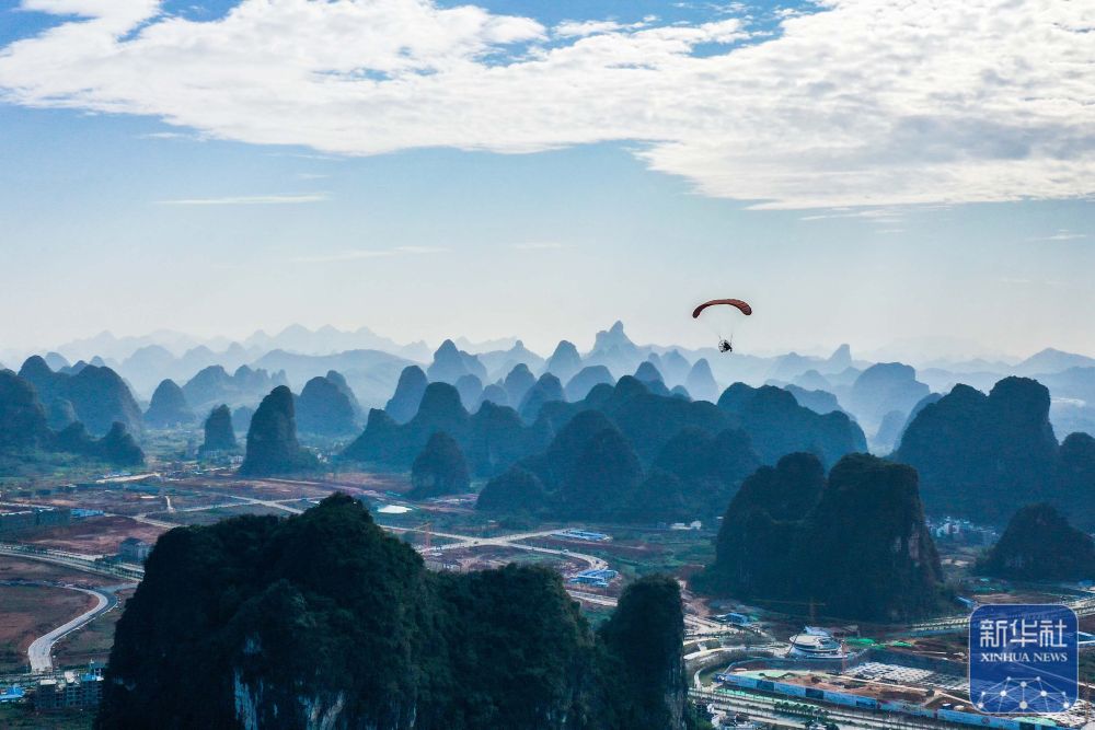 游客在廣西桂林市陽朔縣體驗動力滑翔傘(2019年11月14日攝,無人機照片)。 新華社記者 曹祎銘 攝