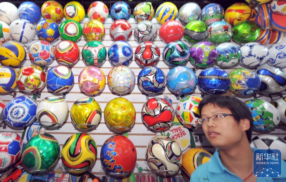 2010年6月23日,一位顧客正在浙江義烏小商品市場內選購足球。據(jù)義烏海關統(tǒng)計,受南非世界杯帶動,當?shù)伢w育用品的月度出口額連續(xù)半年超過1000萬美元,2010年前5個月的出口額比前一年同期增長110%。 新華社記者 王定昶 攝