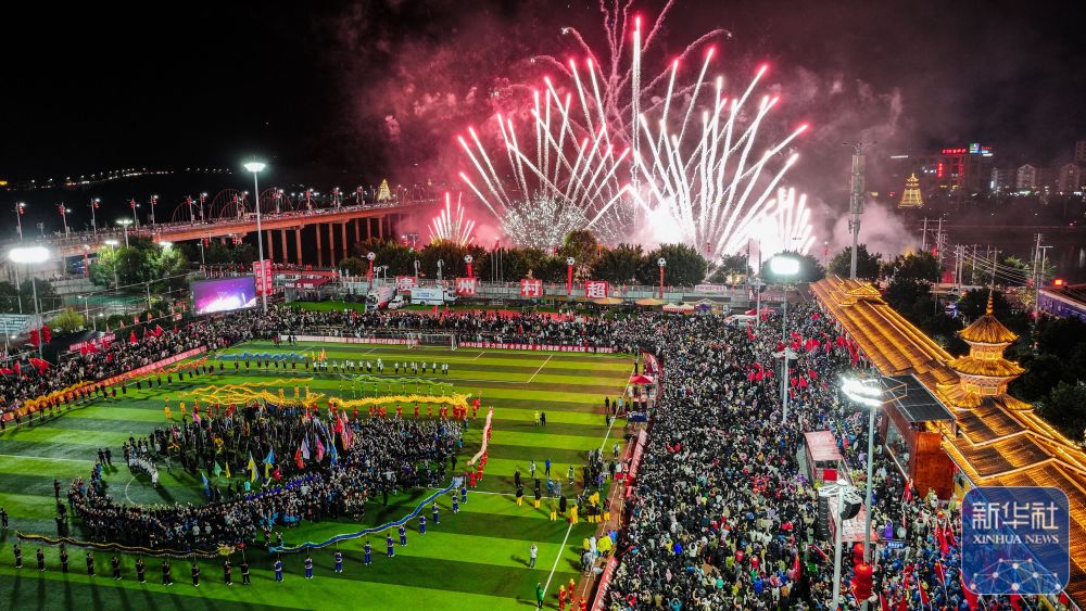 2024年2月3日,音樂煙花秀在“村晚”上演(無人機照片)。當日,2024全國“村晚”示范展示活動暨貴州“村超村晚”在貴州省黔東南苗族侗族自治州榕江縣拉開帷幕。活動包括“村超村晚”文藝展示、2024龍年“村超”賀歲戰(zhàn)等內容。新華社記者 劉續(xù) 攝