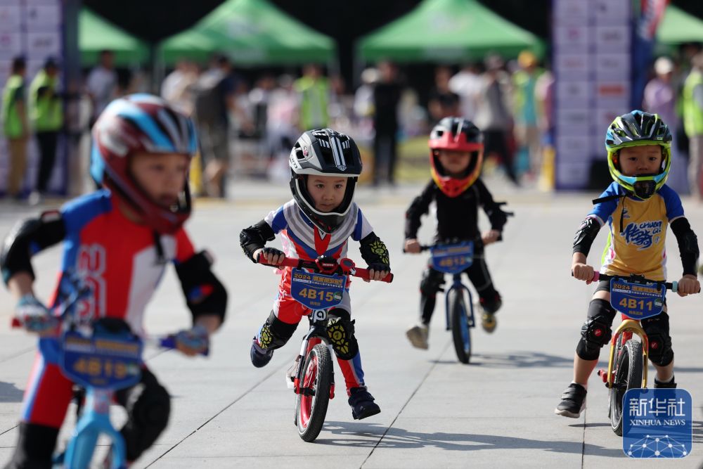 2024年6月22日小選手寒博赟(左二)在比賽中騎行。當日,2024甘肅省兒童平衡車童車聯(lián)賽在甘肅省蘭州市甘肅大劇院廣場開賽。新華社記者 陳斌 攝