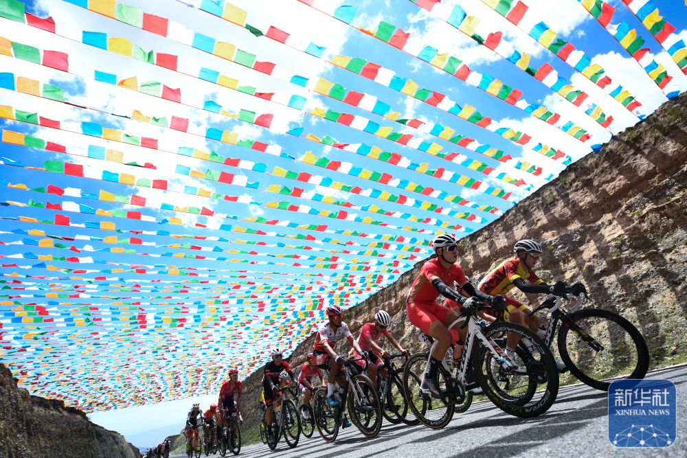 2022年7月29日,參賽選手在比賽中騎行。 當日,第二十一屆環(huán)青海湖國際公路自行車賽進行了第三賽段貴德至共和的角逐。 新華社記者 張龍 攝