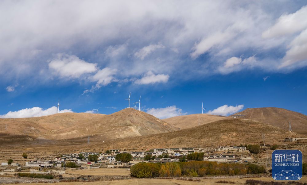 10月17日拍攝的位于西藏日喀則市薩迦縣的風力發電機組及山腳下的村莊。