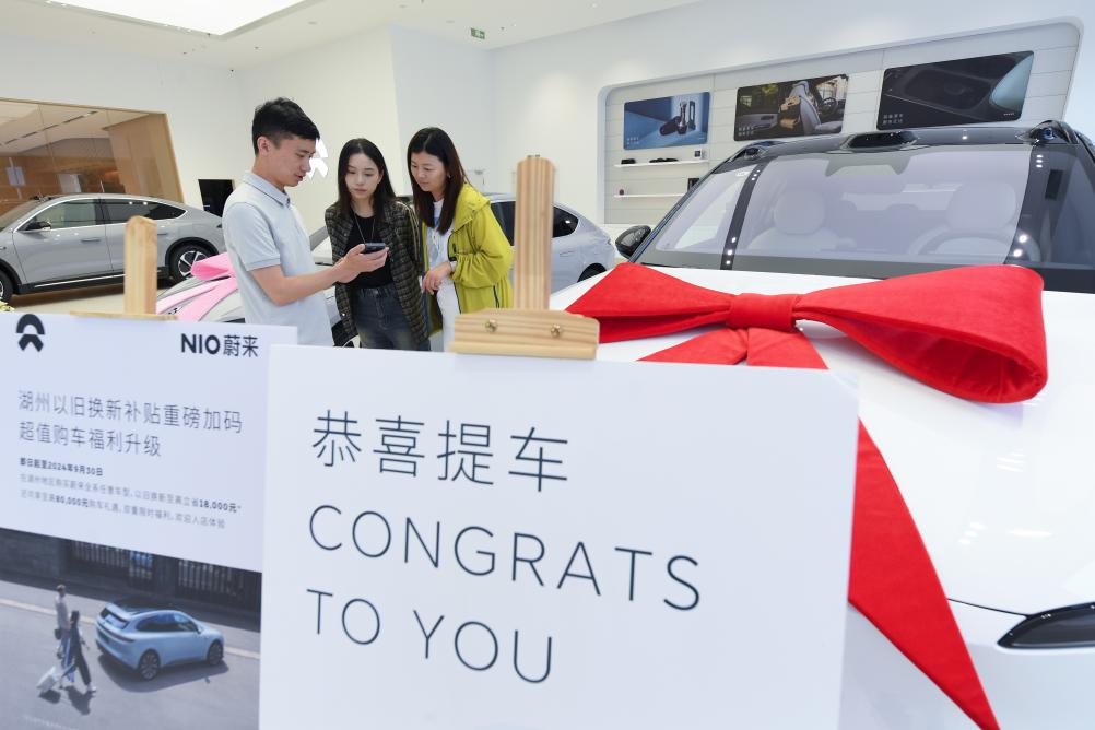 9月24日,在位于湖州市湖東街道的蔚來交付中心,銷售人員向顧客介紹提車后如何申領以舊換新補貼。新華社記者 翁忻旸 攝