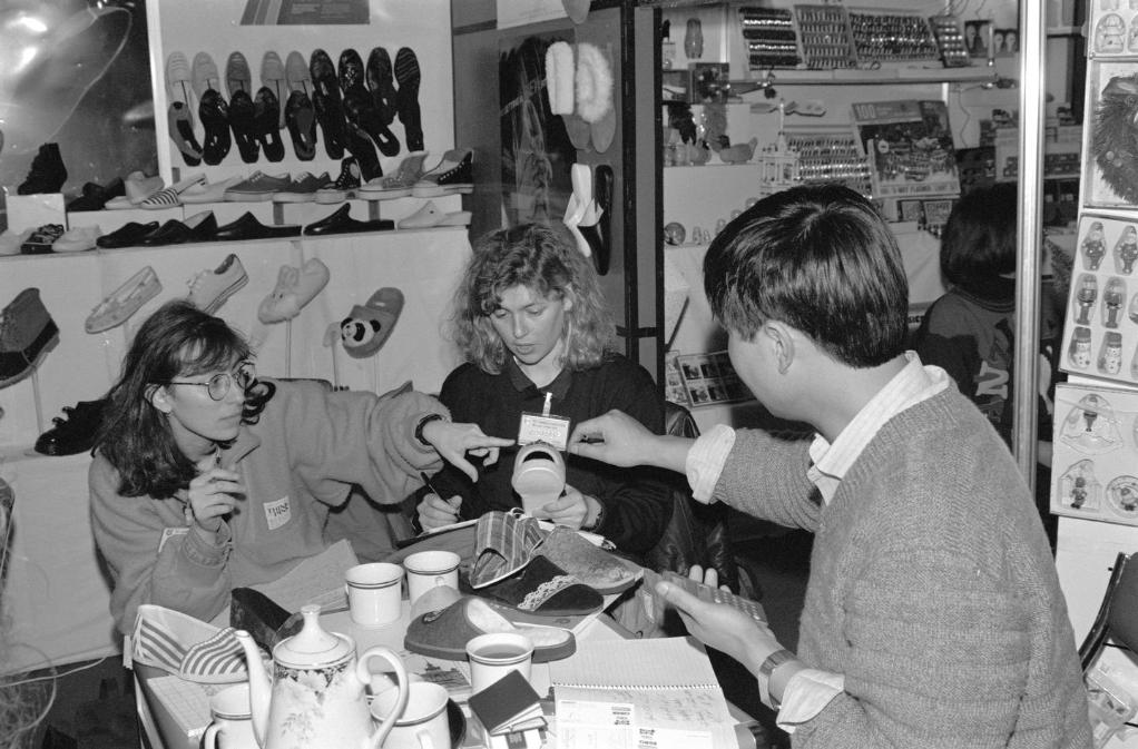 1991年3月,在上海舉行的首屆華東出口商品交易會(后發展為華東進出口商品交易會,簡稱“華交會”)上,兩名意大利客商同浙江省輕工業品進出口公司代表洽談業務。新華社記者 柳中央 攝