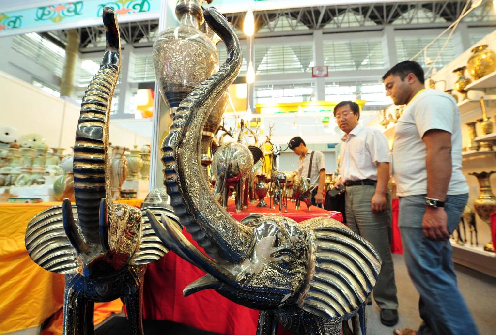 2013年9月15日,在寧夏銀川舉行的首屆中國-阿拉伯國家博覽會上,觀展者咨詢選購巴基斯坦展區的特色展品黃銅雕塑。