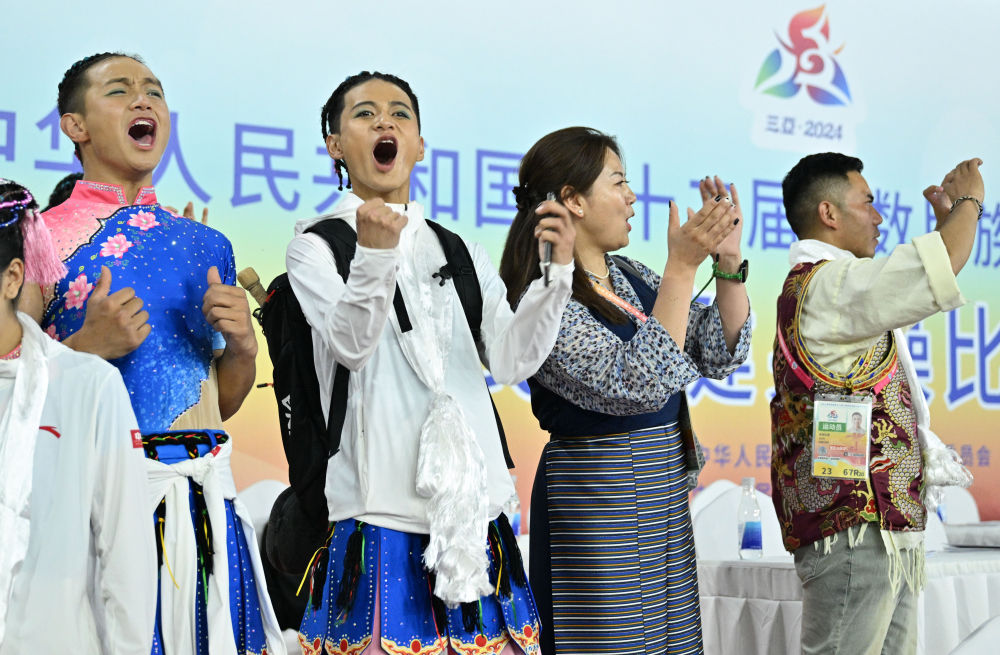 11月28日,西藏隊運動員慶祝團隊獲得民族健身操自選套路(輕器械)一等獎。