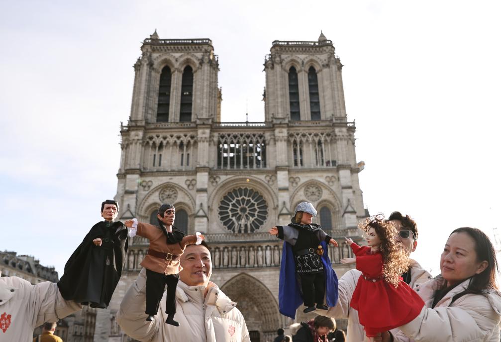 12月15日,在法國巴黎圣母院前,來自中國福建展演團的演員表演布袋木偶戲《巴黎圣母院》。(新華社記者 高靜攝)