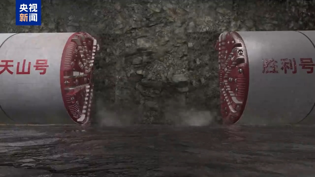 再看工具。兩臺“吞石巨獸”——“天山號”和“勝利號”硬巖掘進機是為打通天山量身定做的。刀盤直徑8.43米,接近3層樓高度。工作時,這對“雙胞胎”從中導洞的兩端朝中間“雙向奔赴”。打通天山可不容易,不僅隧道長度破紀錄,還要穿越16條地質斷裂帶,這就如同在豆腐腦里雕花。特別是在穿越F6地質帶時,36天的隧道涌水量,相當于近30個標準游泳池的水量,掘進速度一下就踩了急剎車,從每天35米銳減到每天只能走3到5米。