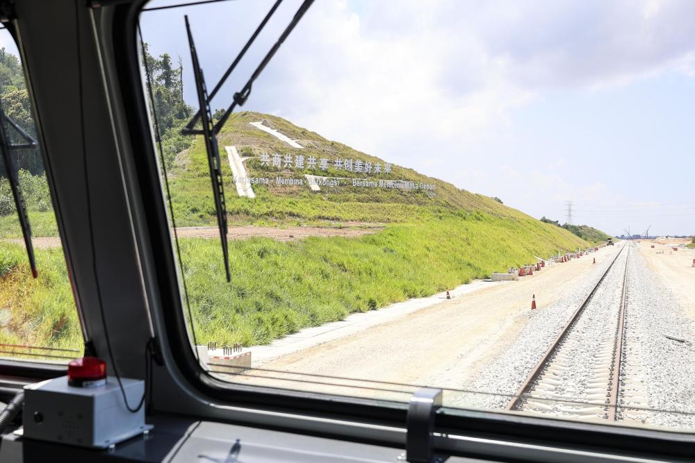 2024年5月6日,在馬來西亞彭亨州馬東鐵項目沿途的山坡上,兩行中文和馬來文大字“共商共建共享,共創美好未來”映入眼簾。新華社記者 程一恒 攝