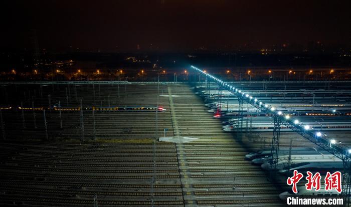 14日凌晨3時,在武漢動車段存車線上,百余組動車整齊排列,勢如“陸地航母”,即將啟航迎接回家的人們。