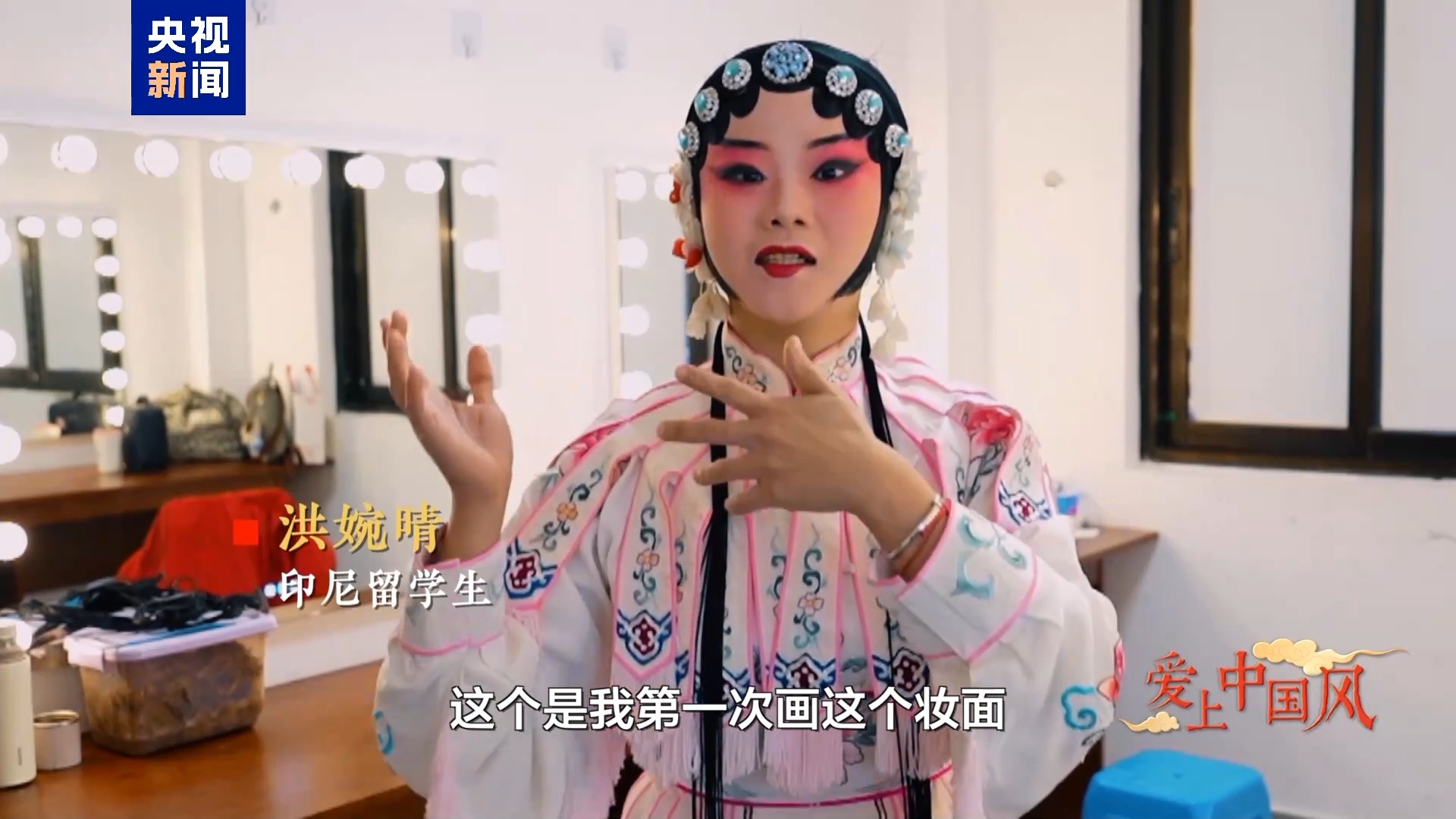 印尼留學(xué)生 洪婉晴:大家好,我是瑪麗莎。我的中文名叫洪婉晴,我來自印尼蘇門答臘島。今年是我到中國的第8個年頭了。喜歡川劇已經(jīng)有至少5年了吧,但像現(xiàn)在有化妝師給我做妝造,可以畫上旦角的妝面,穿上川劇戲服,來演一場戲真的是我人生中的第一次。