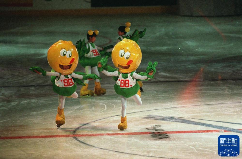 1996年2月4日,在哈爾濱舉行的第三屆亞冬會開幕式上,吉祥物豆豆伴隨著活潑的兒歌,在冰上歡快地滑行。新華社記者 羅更前 攝