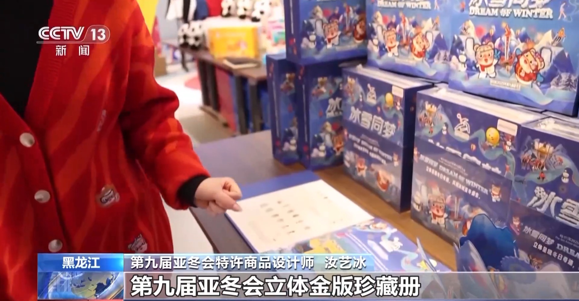 第九屆亞冬會特許商品設計師 汝藝冰:第九屆亞冬會立體金版珍藏冊,第一大主題,就是我們的雙亞冬之城主題,前面就是我們的1996年第三屆亞冬會以及2025年第九屆亞冬會。那第二個板塊,就是我們的奧運冠軍之城主題,是2022年6月份授予哈爾濱的榮譽稱號。