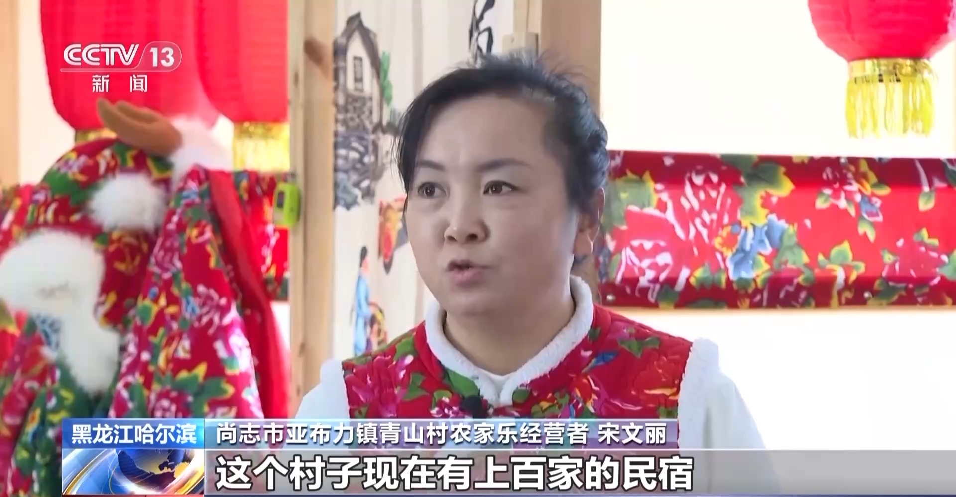 總臺記者 王海樵:現在一走進村子就可以隨處看到這種掛著大紅燈籠的農家樂和民宿,全村有300多戶人家,其中有120多戶都是從事和滑雪旅游產業相關的生意,如今的青山村也成為了名副其實的亞布力山下第一村。