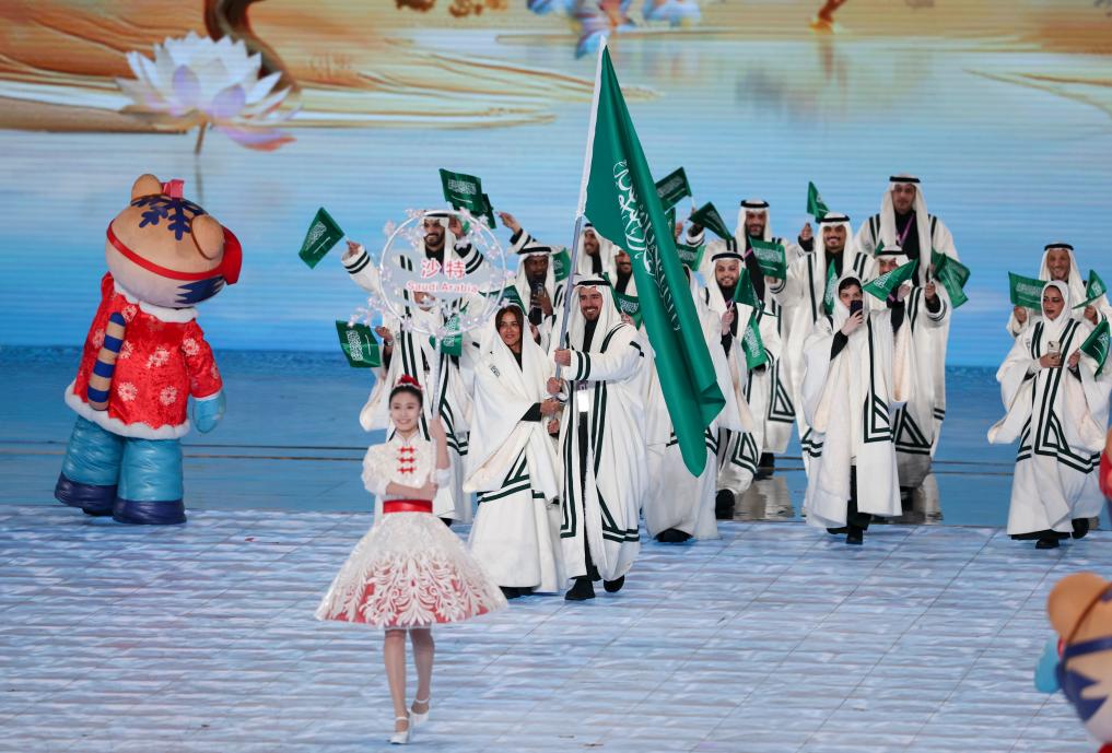 2月7日,沙特阿拉伯體育代表團(tuán)在第九屆亞洲冬季運(yùn)動(dòng)會(huì)開幕式上入場。新華社記者 楊磊 攝
