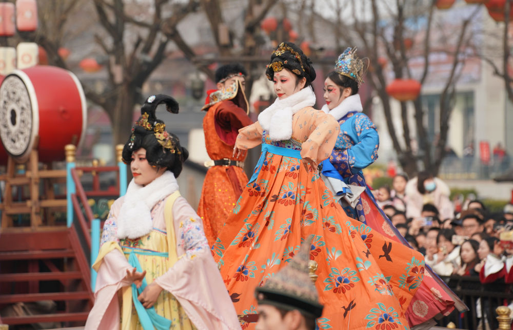 2025年1月31日,游客在陜西西安大唐不夜城景區觀看以唐代歷史文化為背景創作的舞劇。新華社記者 邵瑞 攝