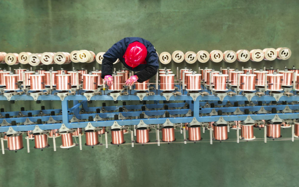 2月13日,在山東省東營(yíng)市廣饒縣李鵲鎮(zhèn)的一家電纜公司的生產(chǎn)車(chē)間內(nèi),工人在進(jìn)行束絲作業(yè)(無(wú)人機(jī)照片)。新華社發(fā)(劉云杰攝)