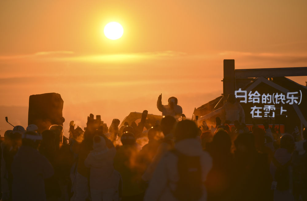 落日余暉灑在阿勒泰市將軍山國際滑雪度假區的山頂,漫山白雪被染成橙粉色。在現場電子音樂強勁的鼓點中,上千名滑雪愛好者歡呼搖擺,在零下十幾度的雪地里感受“蹦雪迪”的歡快。