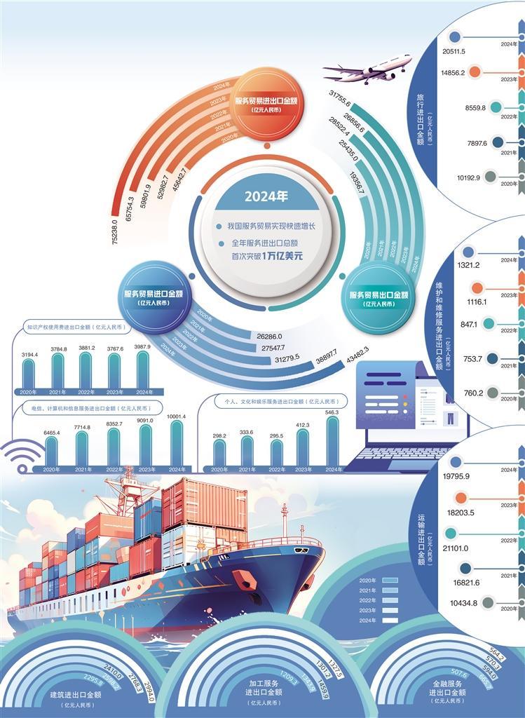 商務部數據顯示,2024年我國服務進出口總額達7.5萬億元人民幣,同比增長14.4%,服務貿易規模首次突破1萬億美元,再創歷史新高。我國服務貿易實現了令人矚目的快速增長,展示了經濟發展的活力和韌性,背后是多個領域的協同發力。