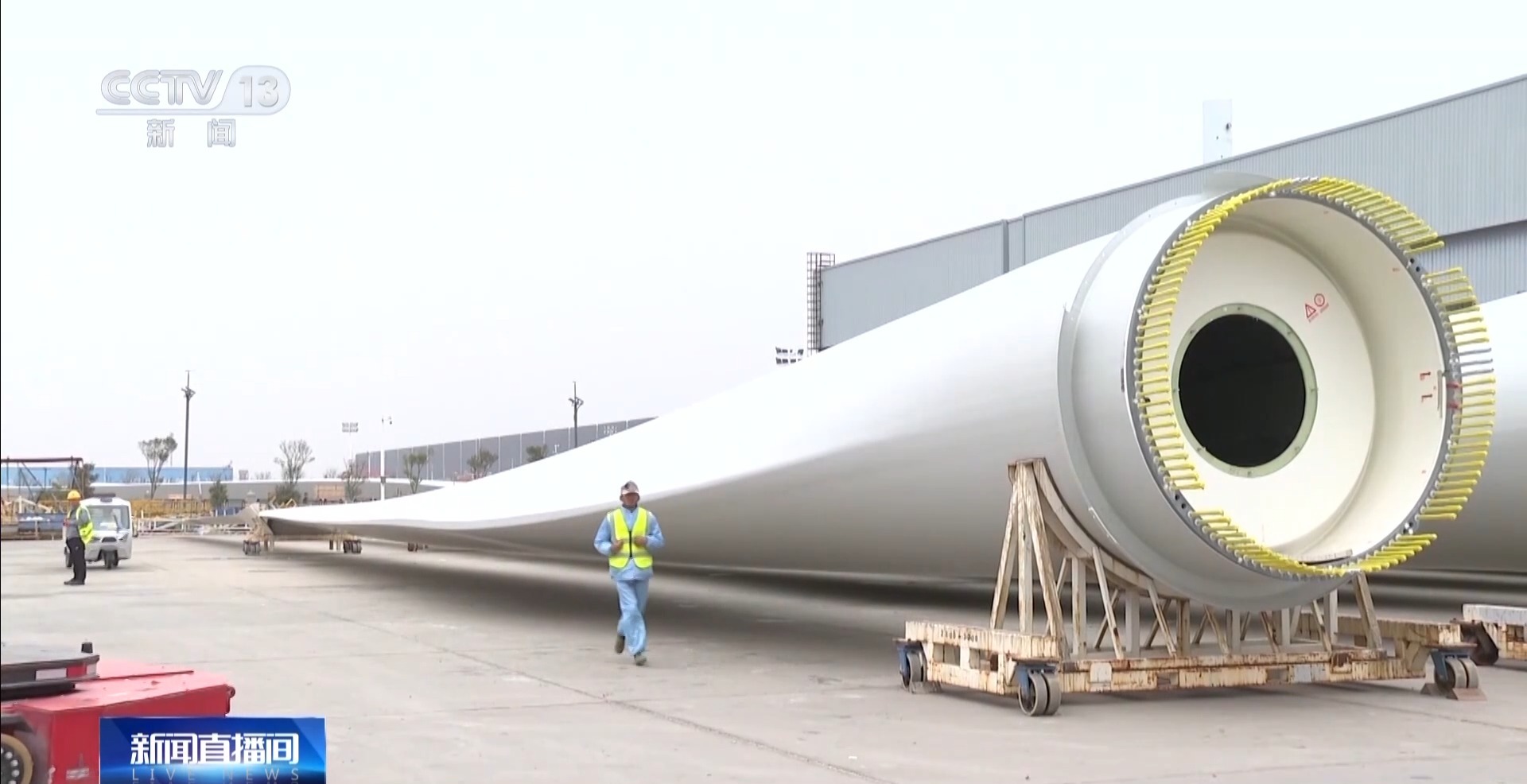 在江蘇的這家企業記者看到,各種不同型號的風機葉片正在進行揮舞和擺振實驗,每只葉片要經歷300萬次左右這樣的實驗。在廠區里,一支82米的風機葉片即將出廠發往風場,和普通的葉片不同,這些葉片在使用特殊溶液后,它的主要材料都是可以回收的。
