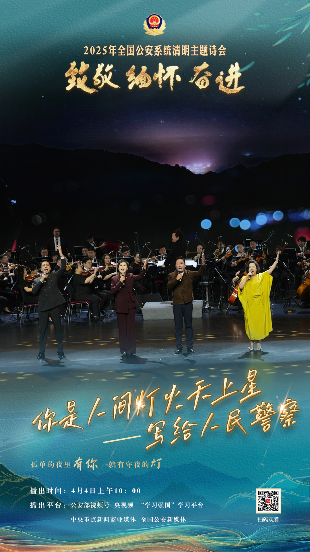 為充分展現全國公安機關和廣大公安民警、輔警時刻銘記習近平總書記的關心關懷,時刻為黨和人民而戰的忠誠政治本色,深情追憶一年來公安系統涌現的英雄模范感人事跡,激勵引導廣大公安民警以更加奮發有為的精神面貌,堅決履行好黨和人民賦予的神圣職責使命,今年清明節當天,公安部新聞宣傳局、全國公安文聯、四川省公安廳聯合舉辦“致敬·緬懷·奮進”2025年全國公安系統清明主題詩會。