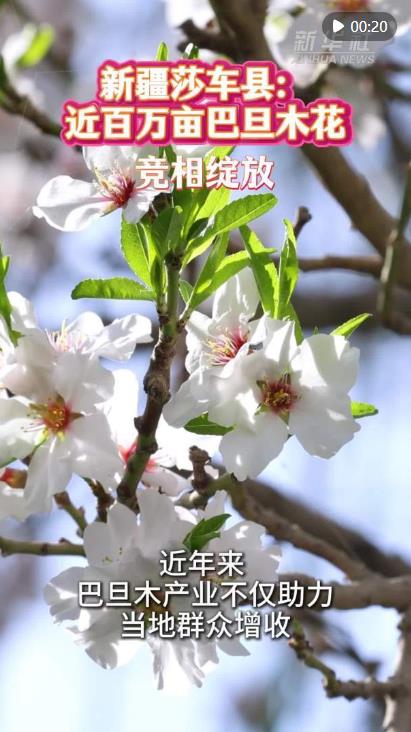 眼下,新疆莎車縣近百萬畝巴旦木花競相綻放,粉白色花朵綿延成畫,芬芳隨風(fēng)飄蕩。