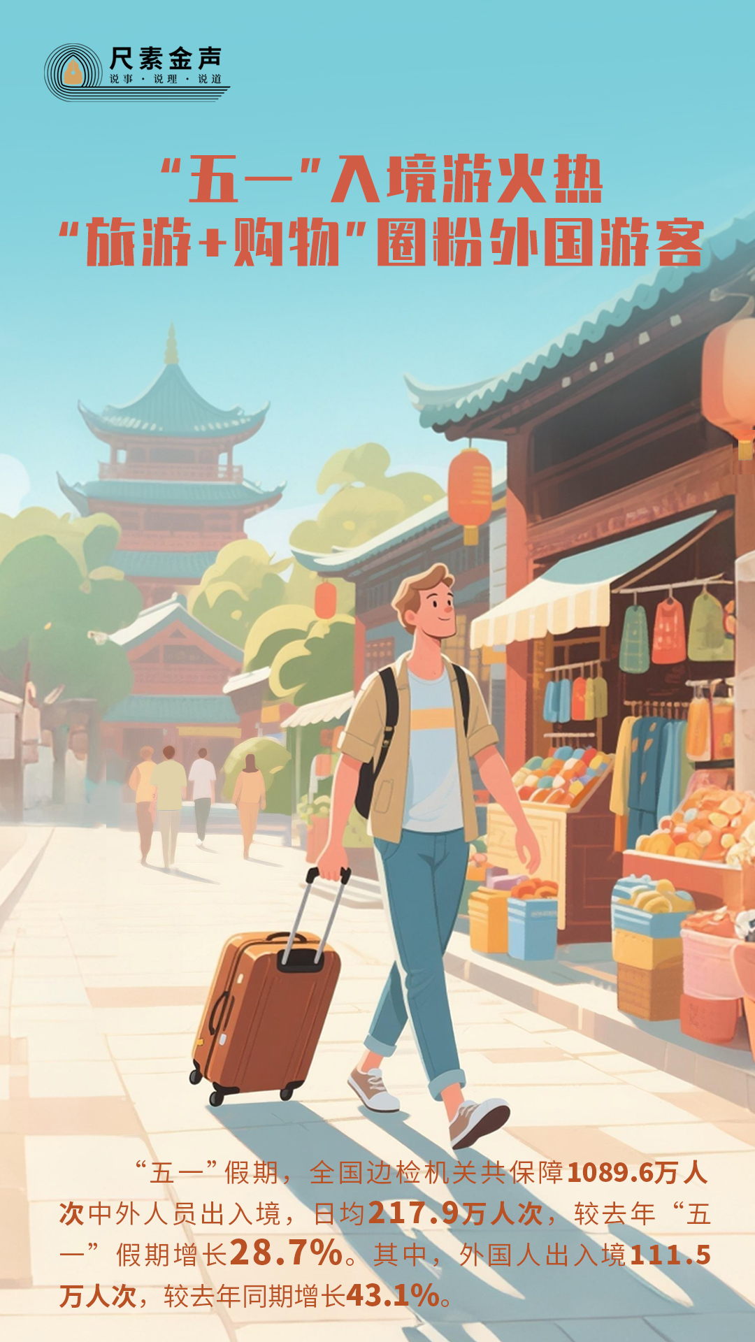 “五一”假期,文旅市場供需兩旺、欣欣向榮,入境游更是熱度高漲。國家移民管理局數據顯示,這個假期,全國邊檢機關共保障1089.6萬人次中外人員出入境,日均217.9萬人次,較去年“五一”假期增長28.7%。其中,外國人出入境111.5萬人次,較去年同期增長43.1%。四成多的高增速,從一個側面折射出中國在全球旅游市場的強大吸引力。