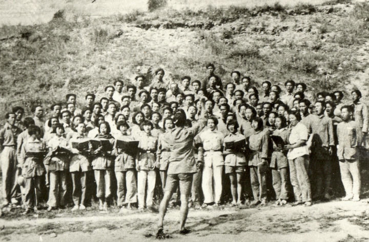 這是1939年冼星海指揮魯藝學員排練《黃河大合唱》的資料照片。