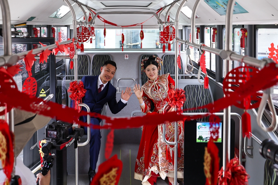 2025年4月30日,“愛情巴士”搭載著新郎新娘前往浙江諸暨市同山鎮唐仁村祠堂進行婚禮儀式。新華社記者 江漢 攝