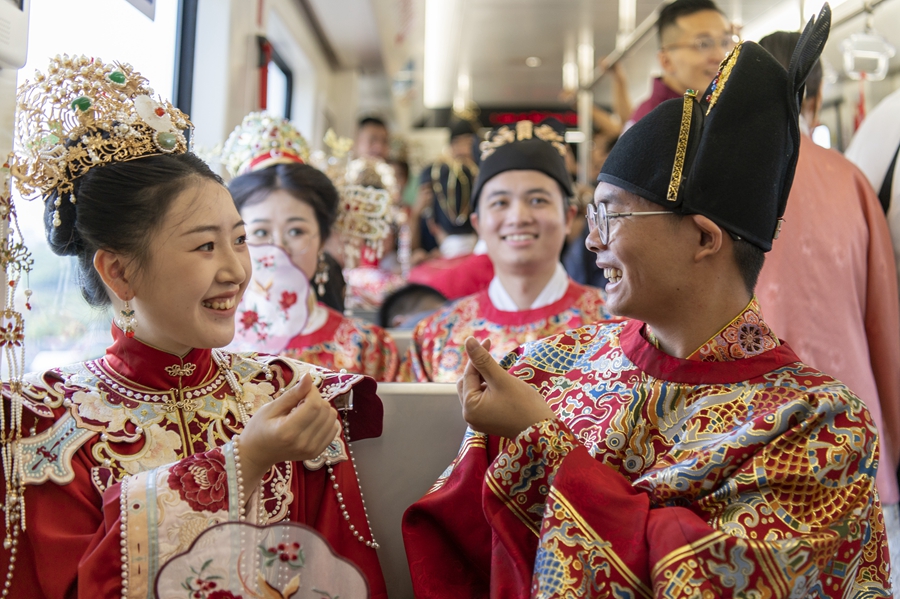 2024年8月10日,新人參加由浙江省金華市民政局與金華市軌道交通集團有限公司聯合舉辦的“緣起金軌、愛在七夕”集體婚禮。新華社發(胡肖飛攝)