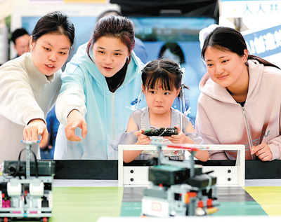 4月28日,在福建省福州市鼓樓區鼓東街道冶山春秋園,小朋友正在體驗足球機器人。謝貴明攝(人民視覺)