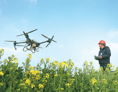 3月6日,江蘇省南通市通州區劉橋鎮無人農機示范基地,種植戶在田間操控調試植保無人機。許叢軍攝(人民視覺)
