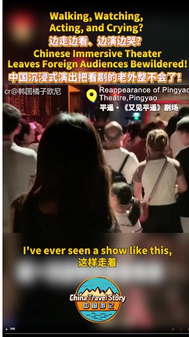 在西安《駝鈴傳奇》中,親歷“狼群”環伺的震撼冒險;走進《又見平遙》,踩著青磚“卷入”晉商江湖;去鄭州“只有河南·戲劇幻城”,回到“教室”重拾青春記憶……“感覺到電影里面啦”“太壯觀了”,觀看這些中國沉浸式演出的老外們上一秒還在咧嘴大笑,下一秒就哭成了淚人。