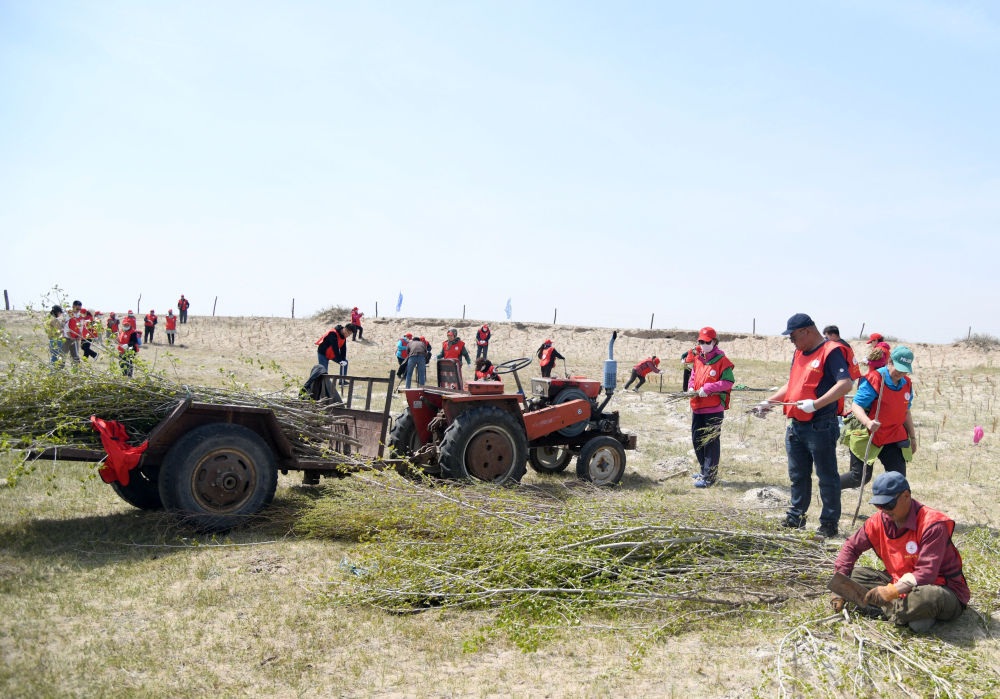人們在地處渾善達克沙地的正藍旗寶紹岱蘇木開展植綠活動。新華社 發