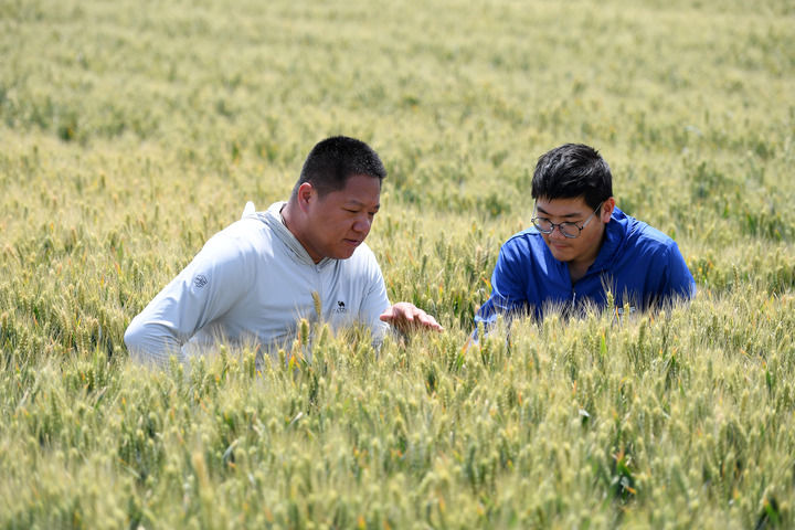 賈俊杰(左)和農業技術員在山西運城永濟市虞鄉鎮麥田里查看小麥生長情況(2025年5月21日攝)。新華社發(薛俊攝)